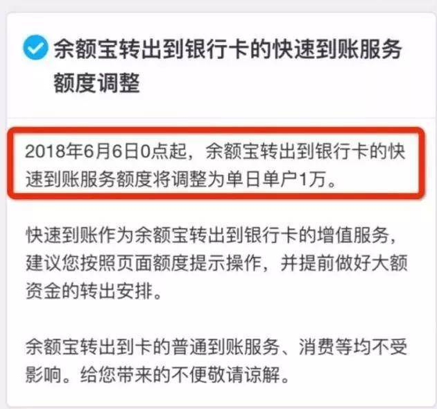 5月14日,支付宝再客户端发出公告,6月6日0点起,余额宝转出到银行卡当日快速到账额度有所调整,从每日限额5万元调整到1万元,转出到银行卡普通到账服务(下个交易日到账额度)及消费支付等均不受影响。